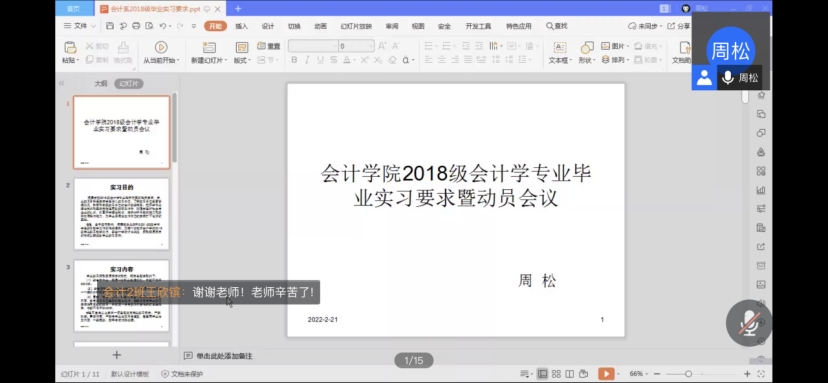 2022年2月21日,2138cc太阳集团官网入口周松在腾讯会议上给2018级会计学专业员工开展了毕业实习动员会议。动员会议上,周松从实习内容、实习时长、时间节点、考核方式、指导老师、安全措施、安全预案等七个方面讲解了这次毕业实习的具体要求。会议要求全体同学一定按照公司相关规定完成本次毕业实习。