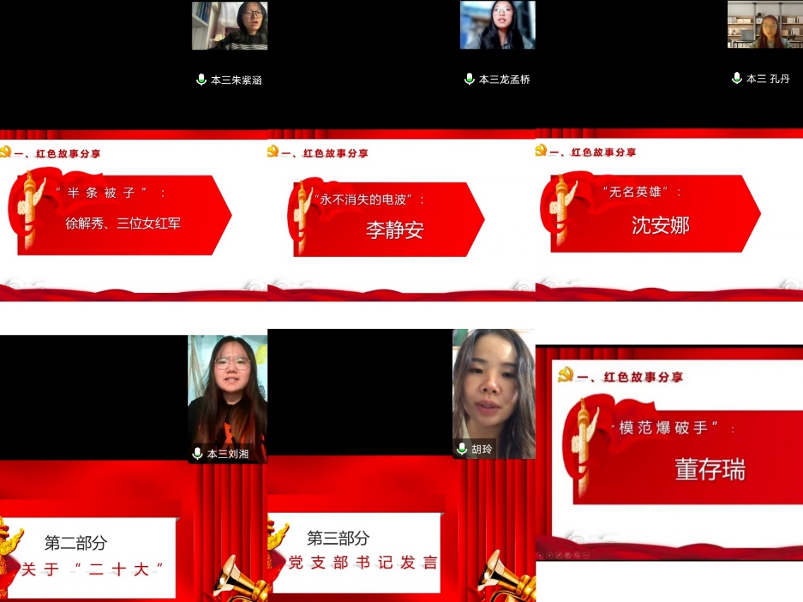 2138cc太阳集团官网入口本科生第三党支部开展“喜迎二十大”红色故事分享会活动,学习老一辈的无产阶级革命家和革命先烈的先进事迹,包括“模范爆破手”董存瑞、“半条被子的温暖”、“战斗在敌人心脏的无名英雄”沈安娜、“永不消逝的电波”李静安,教育引导广老员工党员传承红色基因,赓续红色血脉,走好新时代的长征路。