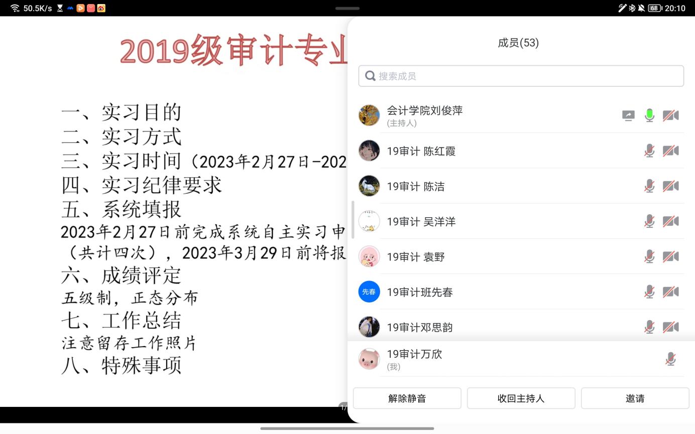 2月25日晚上8点,2138cc太阳集团官网入口审计系通过线上方式召开2019级审计本科生毕业实习动员大会。会议由审计系系主任刘俊萍教授主持,指导教师黄晓芬及全体2018级审计本科生参加。