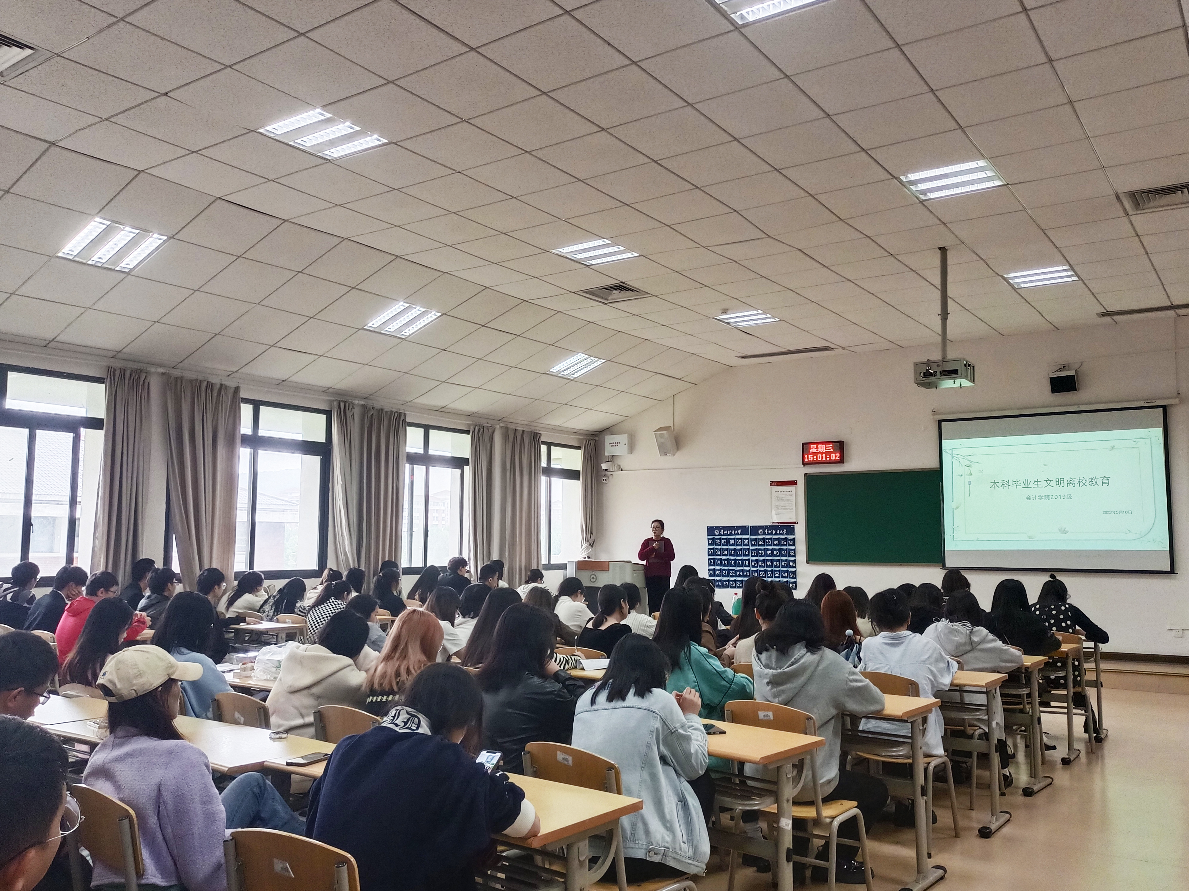 5月10日,2138cc太阳集团官网入口在崇德楼512教室举行2019级本科生文明离校教育,公司共计276名本科毕业生到场参加,辅导员蒲亚晴担任主讲人。