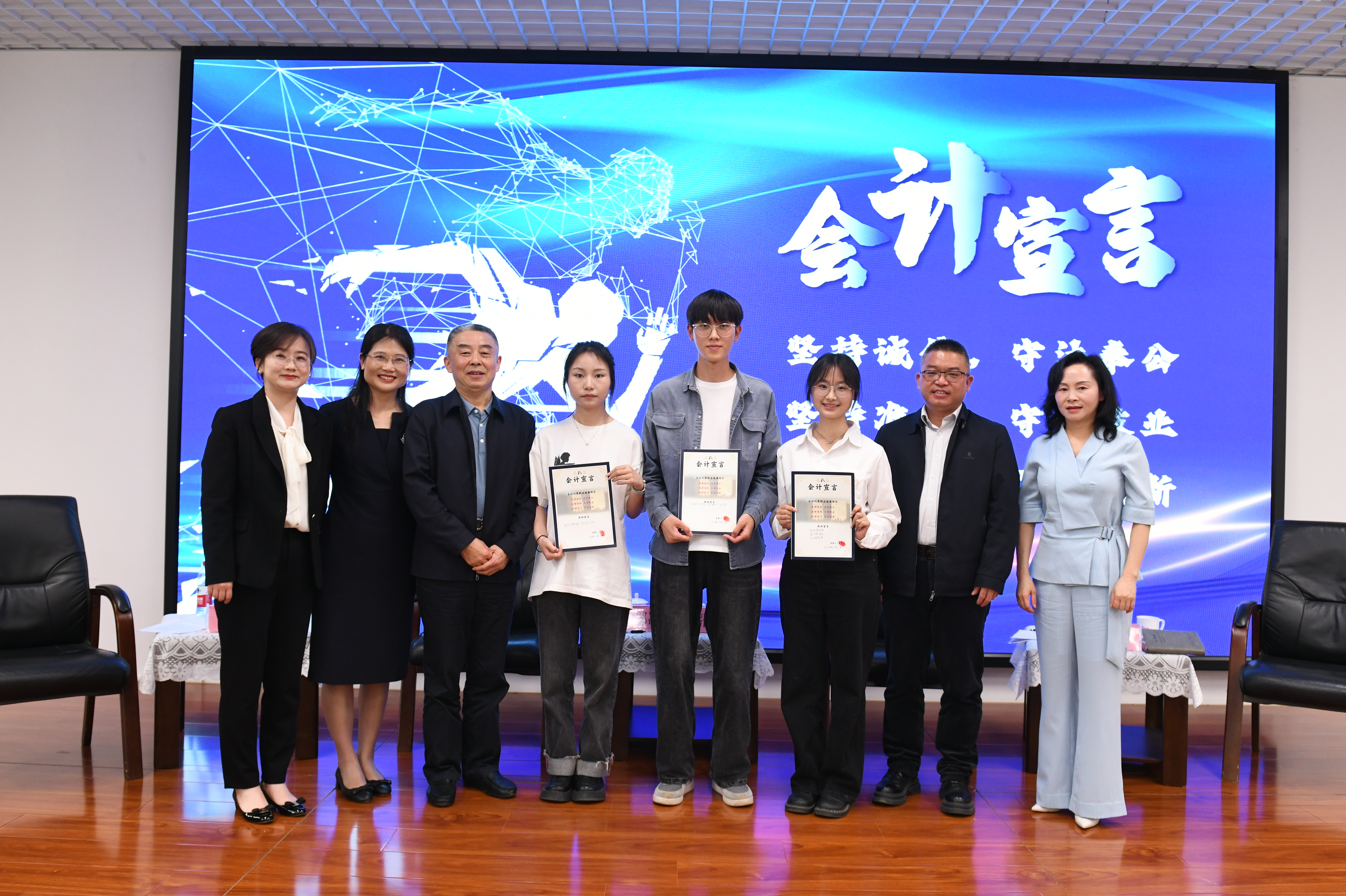 随后,同学们与嘉宾进行了现场互动,并在嘉宾的见证下,签署了自己的会计宣言;每位嘉宾均为同学们送上了一句话的寄语,激励他们坚持学习,努力追求属于自己的“星辰大海”。最后,徐筱彧进行了总结。