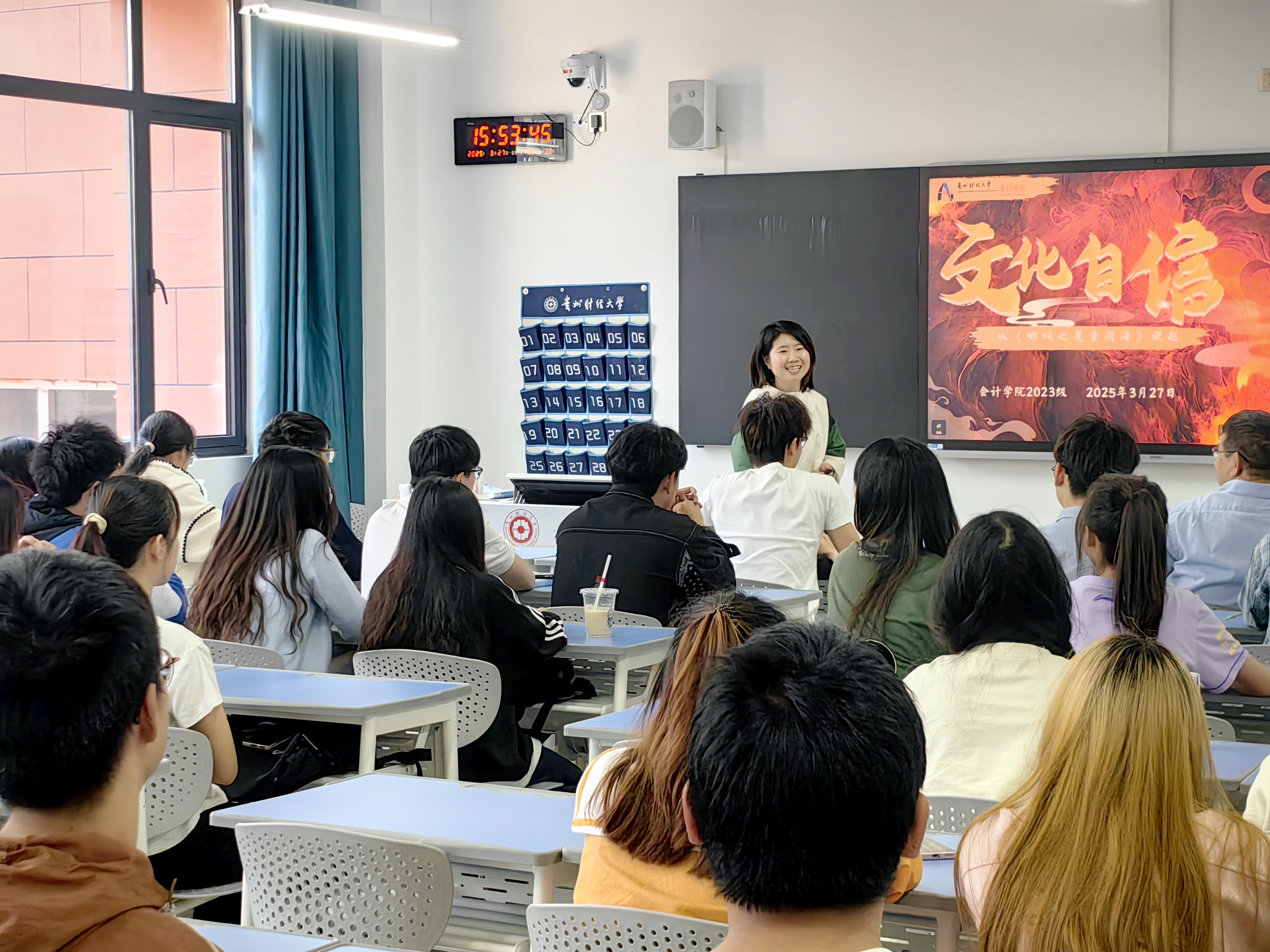 班会开场,张晓梅巧妙地通过 “模仿石矶娘娘”、“健身小挑战” 等趣味小游戏,瞬间点燃了现场气氛,让同学们热情高涨。随后,张晓梅以热门动画电影《哪吒之魔童闹海》为切入点,深入浅出地与同学们探讨文化自信,生动有趣的讲解让同学们深刻感受到文化自信的内涵与重要性。
