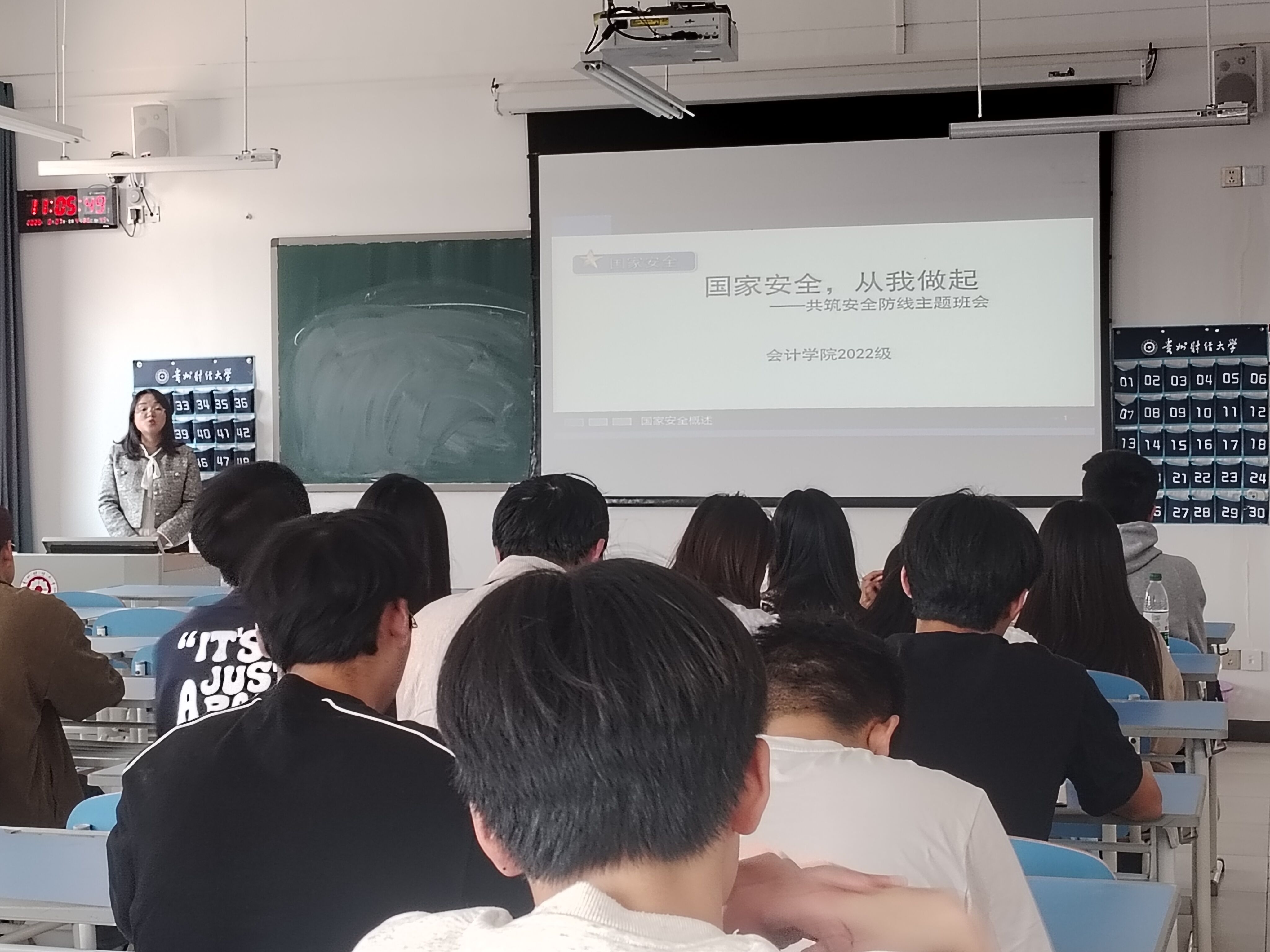 班会开始,张老师通过一段精彩的视频引入班会主题。视频中展示了一系列涉及国家安全的案例,从网络信息泄露到境外势力的渗透,这些生动的画面让同学们深刻感受到国家安全问题无处不在,形势严峻。其次张老师对国家安全的概念及内容进行具体阐述。最后张老师引导同学们讨论问题,维护国家安全,老员工应该怎么做。