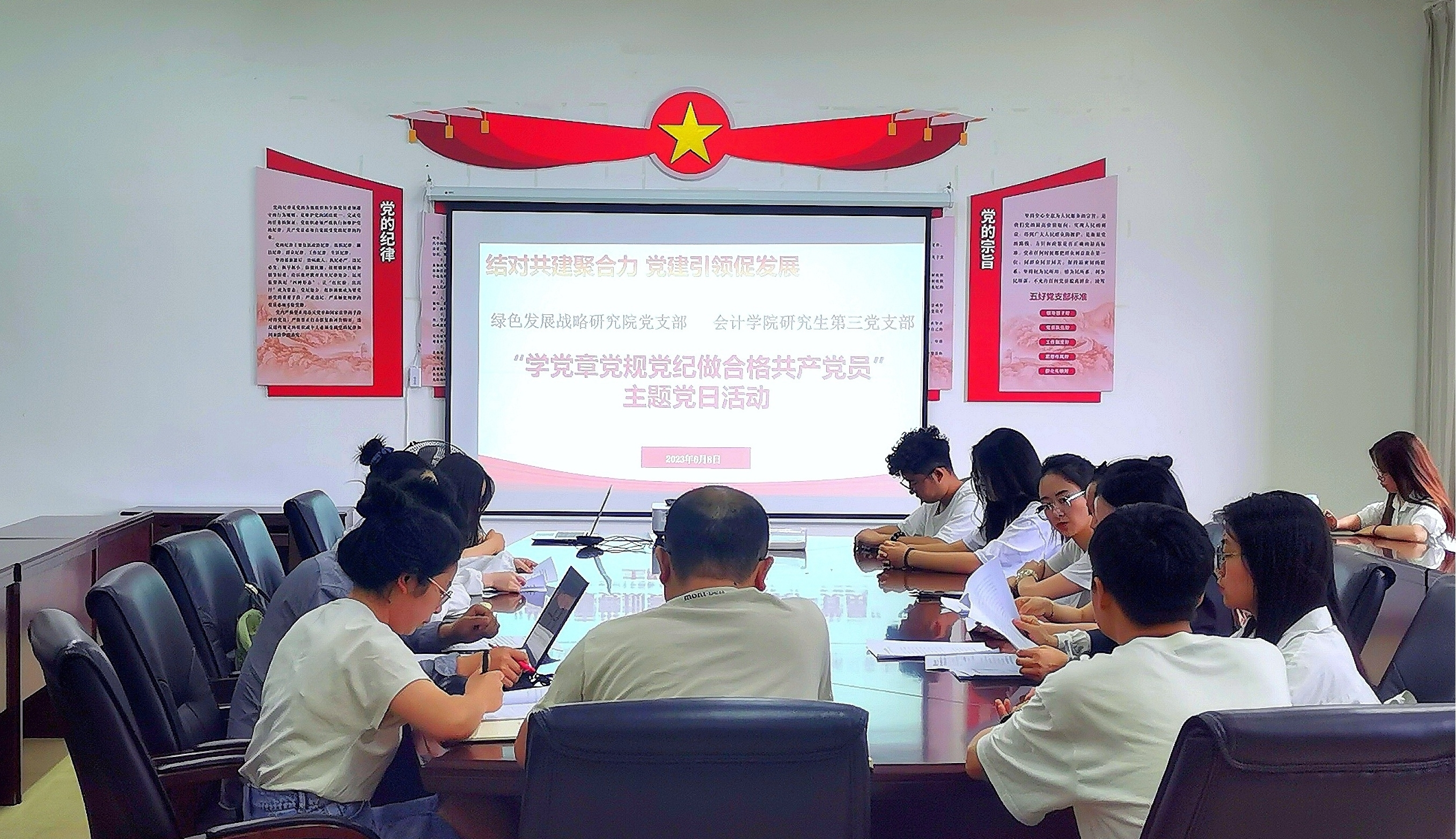 为进一步强化党员遵纪守法意识,增强学习贯彻党内法规的政治自觉和行动自觉同时落实学习贯彻习近平新时代中国特色社会主义思想主题教育的有关要求6月8日下午,绿色发展战略研究公司党支部2138cc太阳集团官网入口研究生第三党支部在进德楼317会议室开展“学党章党规党纪 做合格共产党员”结对共建主题党日活动。