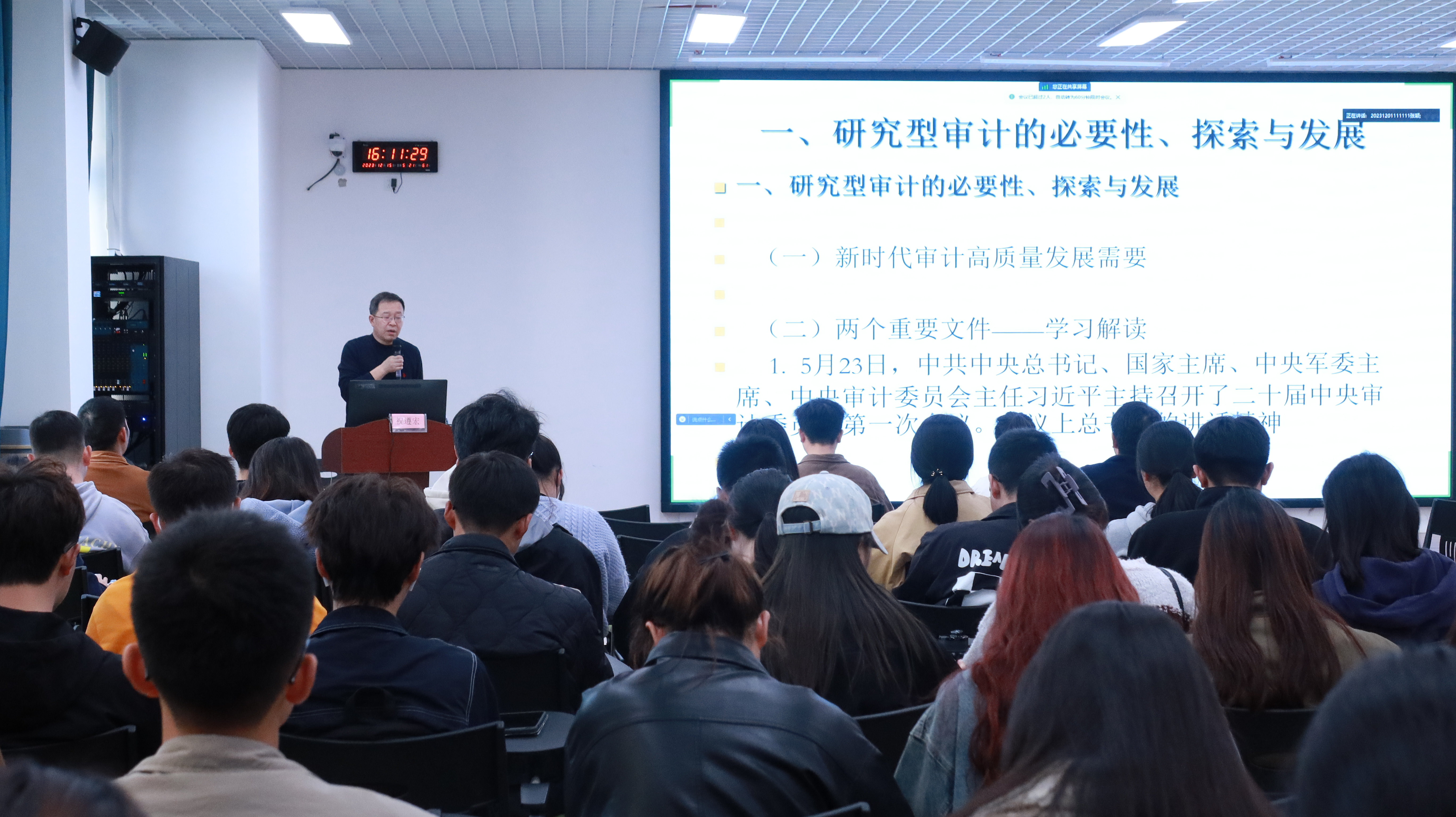 2023年12月15日,南京审计大学教授、审计署国家审计指南专家委员会委员祝遵宏为我院研究生同学开展了题为《研究型工程审计实践与探索》的线下专题讲座。