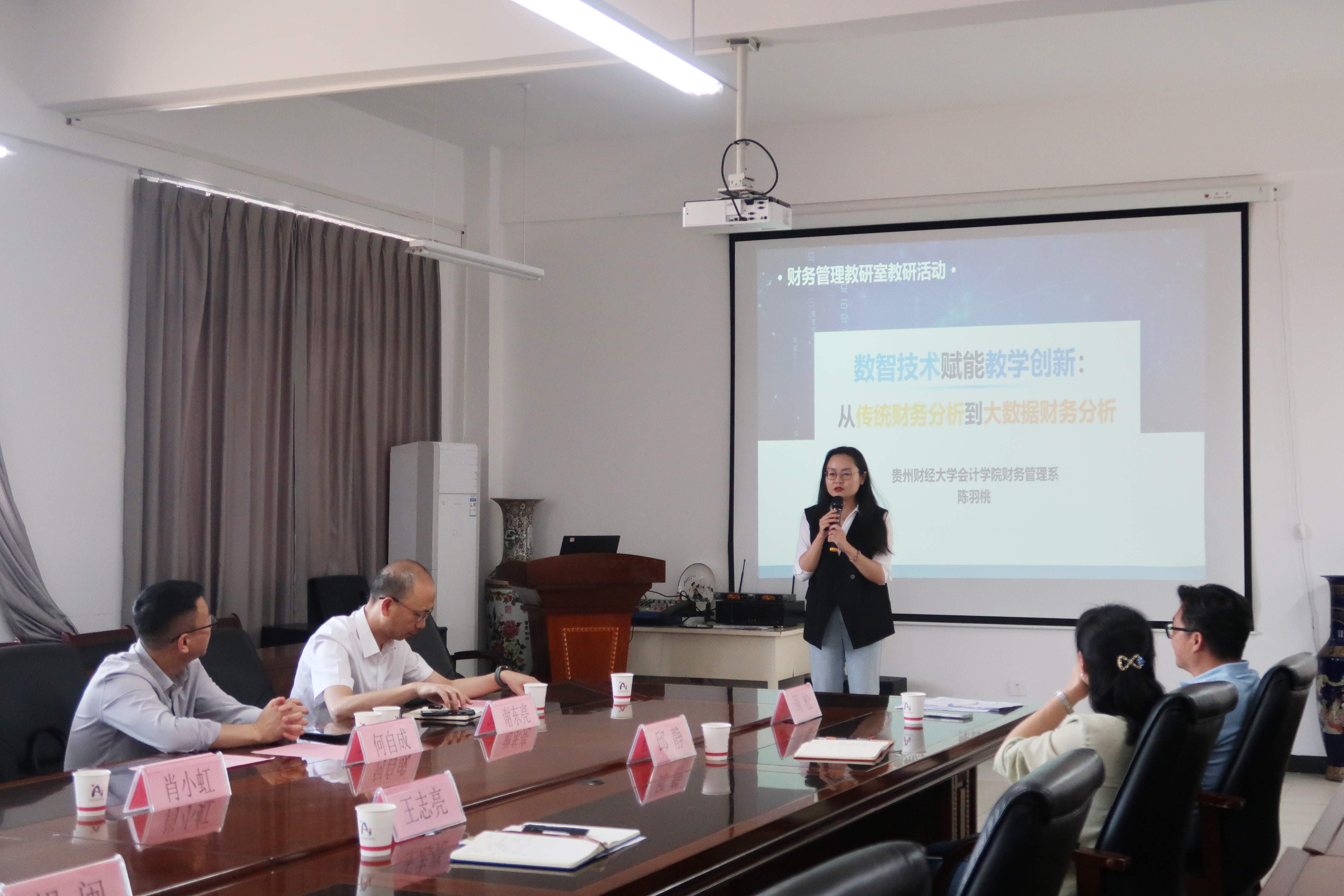 随后,会计系系主任陈羽桃老师围绕《数值技术赋能教学创新:从传统财务分析到大数据财务分析》作了讨论发言,以财务分析课程教学为切入点,详细阐述如何从科学设计课程思政体系、推进课程体系数智化转型、基于BOPPPS模型创新教学模式以及实施多元化课程考核方式四个方面进行课程建设。
