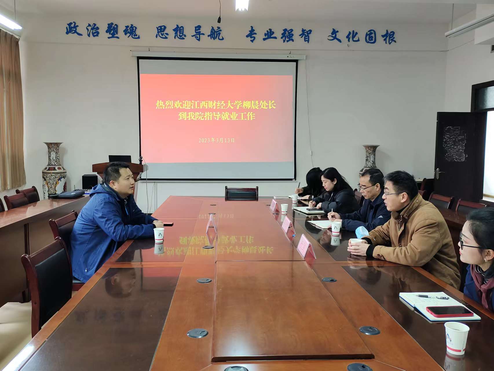 为进一步做好毕业生就业服务工作,提高公司2023届毕业生就业工作质量,2023年3月13日,江西财经大学招就处处长柳晨受邀到公司交流就业工作,公司党委书记聂永刚、经理杜剑、党委副书记黄忠莉以及毕业班辅导员蒲亚晴、张筱悦到场参加交流会议。