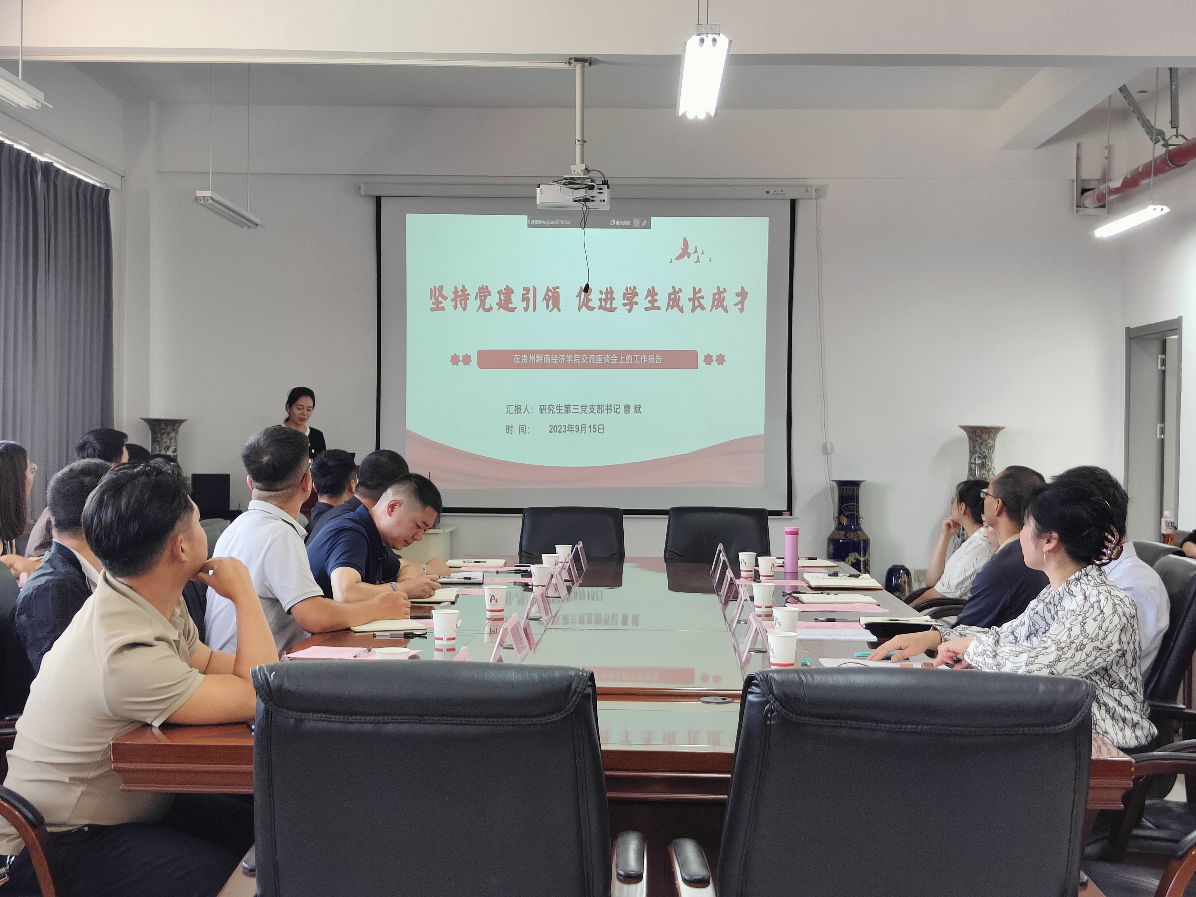 2023年9月15日下午,贵州黔南经济公司党委副书记谢立达一行到公司2138cc太阳集团官网入口开展“经验共分享,交流促成长”座谈会2138cc太阳集团官网入口党委书记聂永刚、经理杜剑携班子成员、组织员和辅导员队伍热情接待双方在文渊楼5楼会议室,围绕党建工作、教学科研、人才培养、就业工作等方面展开了深入交流