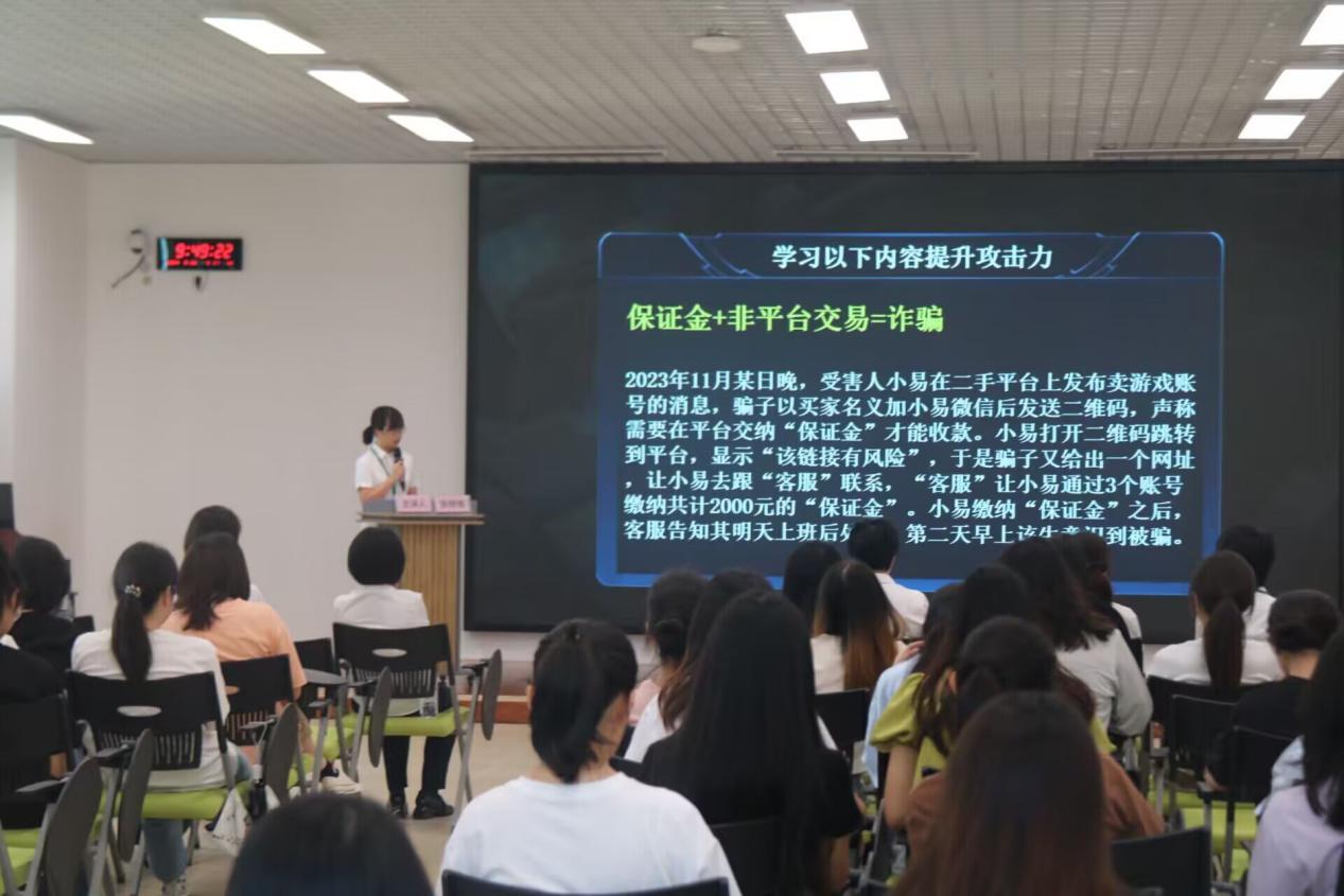 此次讲座的主讲人为花溪农商银行运营管理中心的反诈专员张杨铕,她从事了2年的反诈工作,具备丰富的实战经验。通过生动的视频案例,主讲人为同学们详细讲解了当前常见的电信诈骗手段,如虚假投资、客服退款、刷单返利、网购门票诈骗、冒充熟人诈骗、网络游戏产品虚假交易、冒充公检法等。同时也向同学们普及了帮信罪等相关法律,警醒大家切勿成为电诈“工具人”。主讲人以案说法,深入浅出地剖析了诈骗分子的作案手法和惯用伎俩,提醒大家在日常生活中要提高警惕,保护好个人信息,做到“不轻信、不汇款、不透露、不转账”。