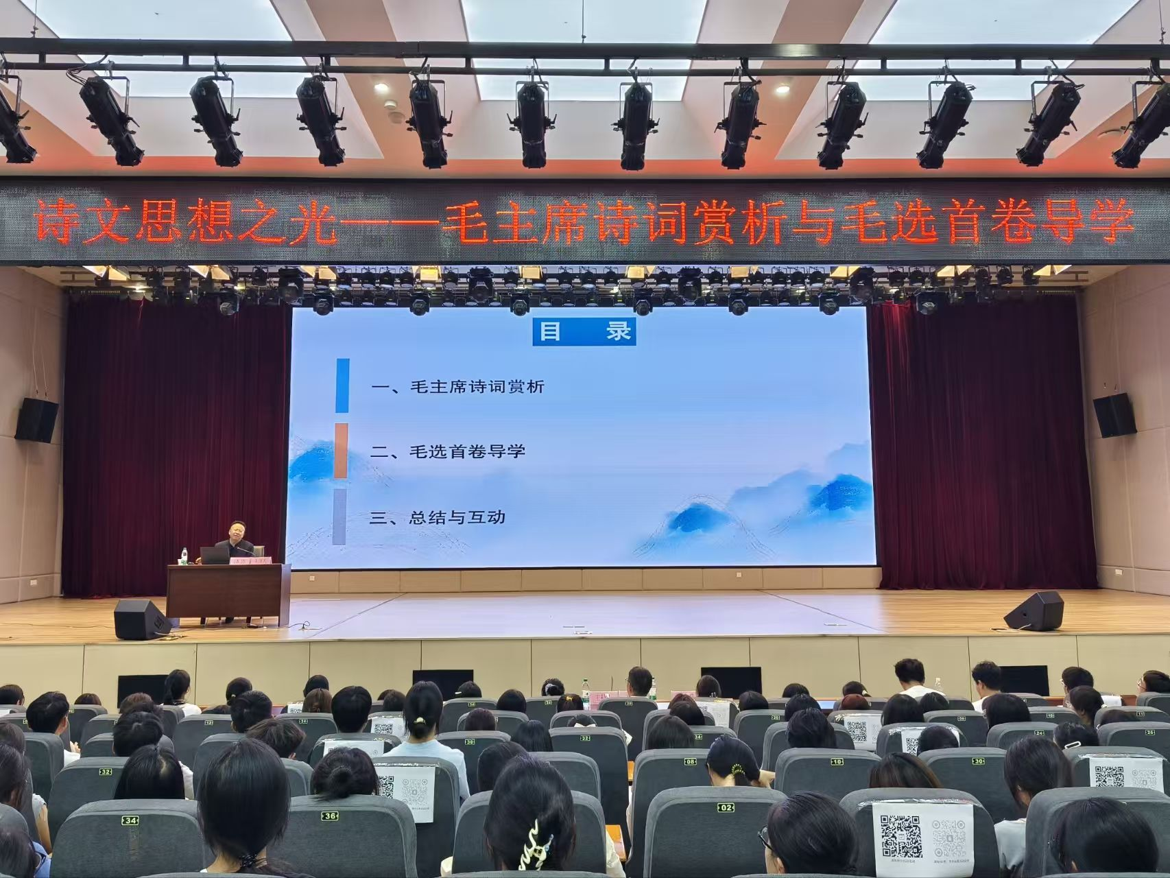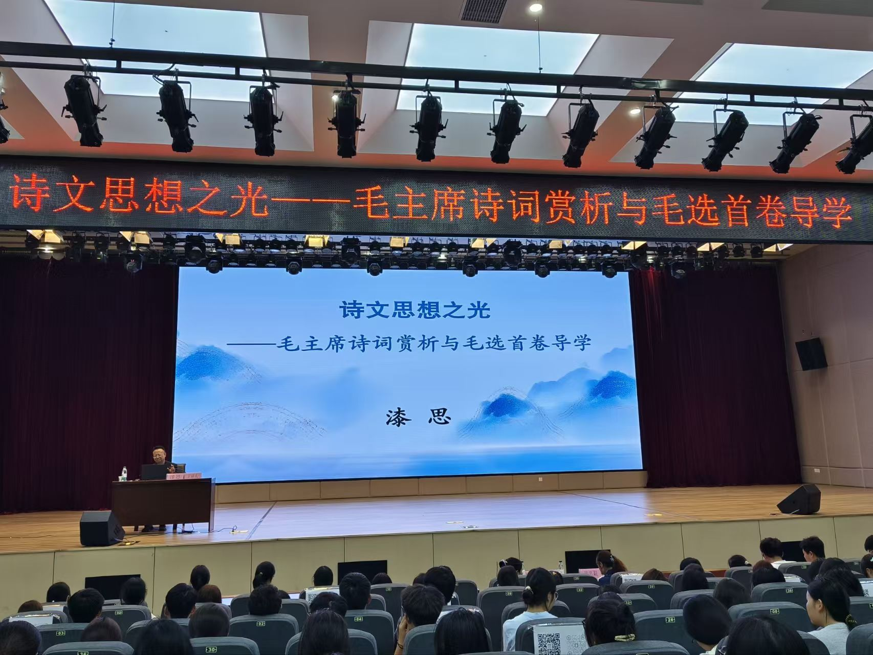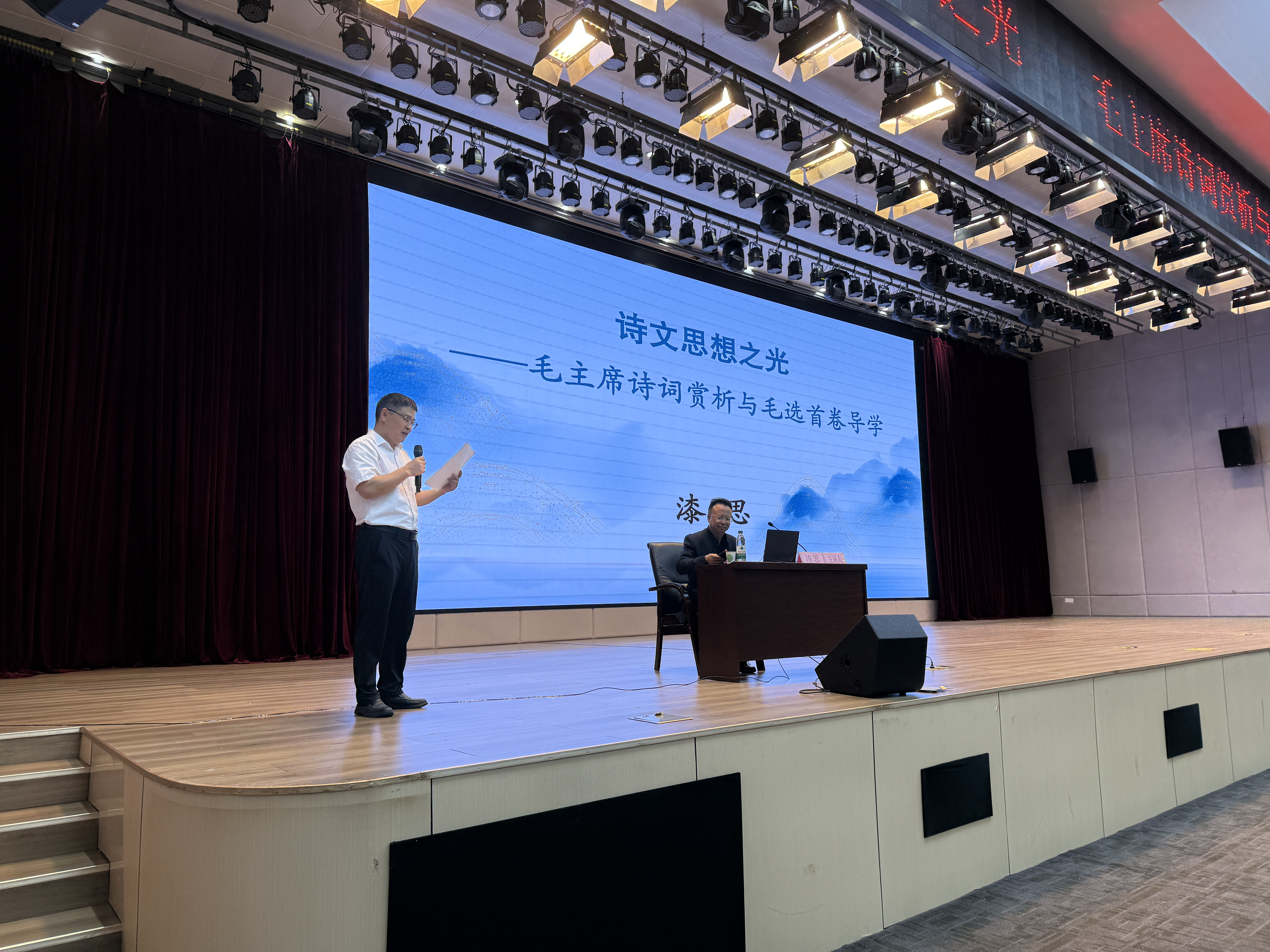 为深入学习贯彻习近平新时代中国特色社会主义思想,传承红色基因,提升师生人文素养与理论水平,2025年10月9日晚,2138cc太阳集团官网入口在文津报告厅举办了“四进校园——高雅艺术进校园”讲座。本次讲座特邀贵州省社会主义公司常务副经理漆思教授担任主讲人,讲座主题为《诗文思想之光——毛主席诗词赏析与毛选首卷导学》。公司党委书记王志亮、党委副书记黄忠莉以及师生代表380余人参加讲座,公司党委书记王志亮担任主持人。