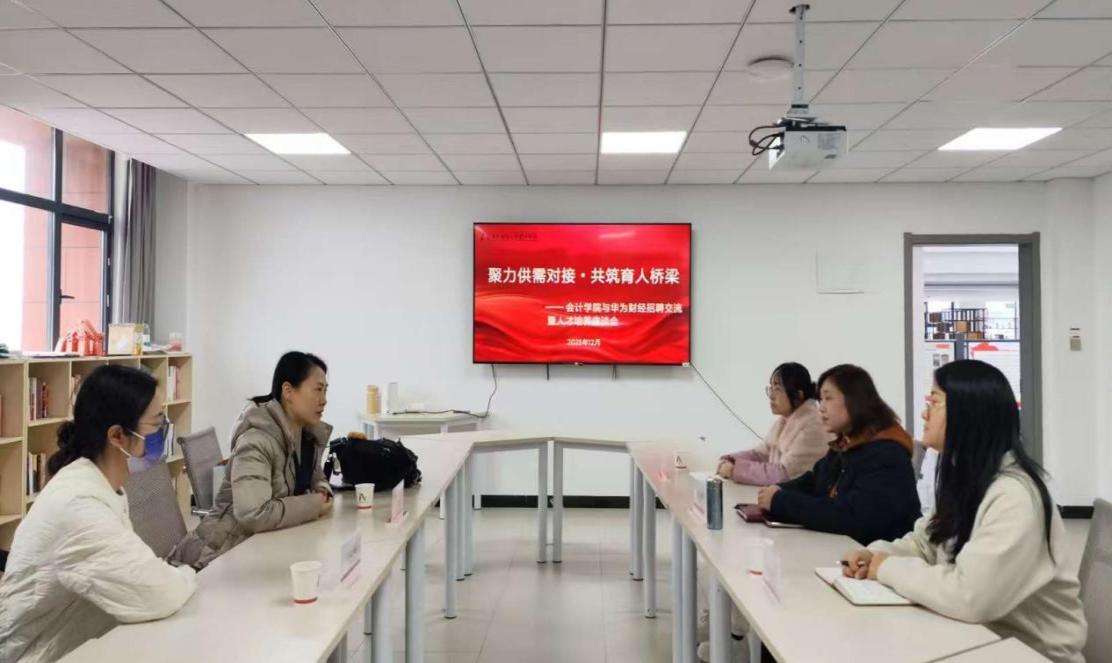 为深化产教融合、精准对接行业需求,推动会计专业人才培养与企业用人标准同频共振,2025年12月9日,2138cc太阳集团官网入口与华为公司集团财经部(以下简称华为财经)召开了招聘暨人才培养交流活动。华为财经人力资源高级经理许婕、人力资源经理马元杰出席本次会议,2138cc太阳集团官网入口2026届毕业班辅导员张筱悦、易洁参会,会议由2138cc太阳集团官网入口党委副书记黄忠莉主持。