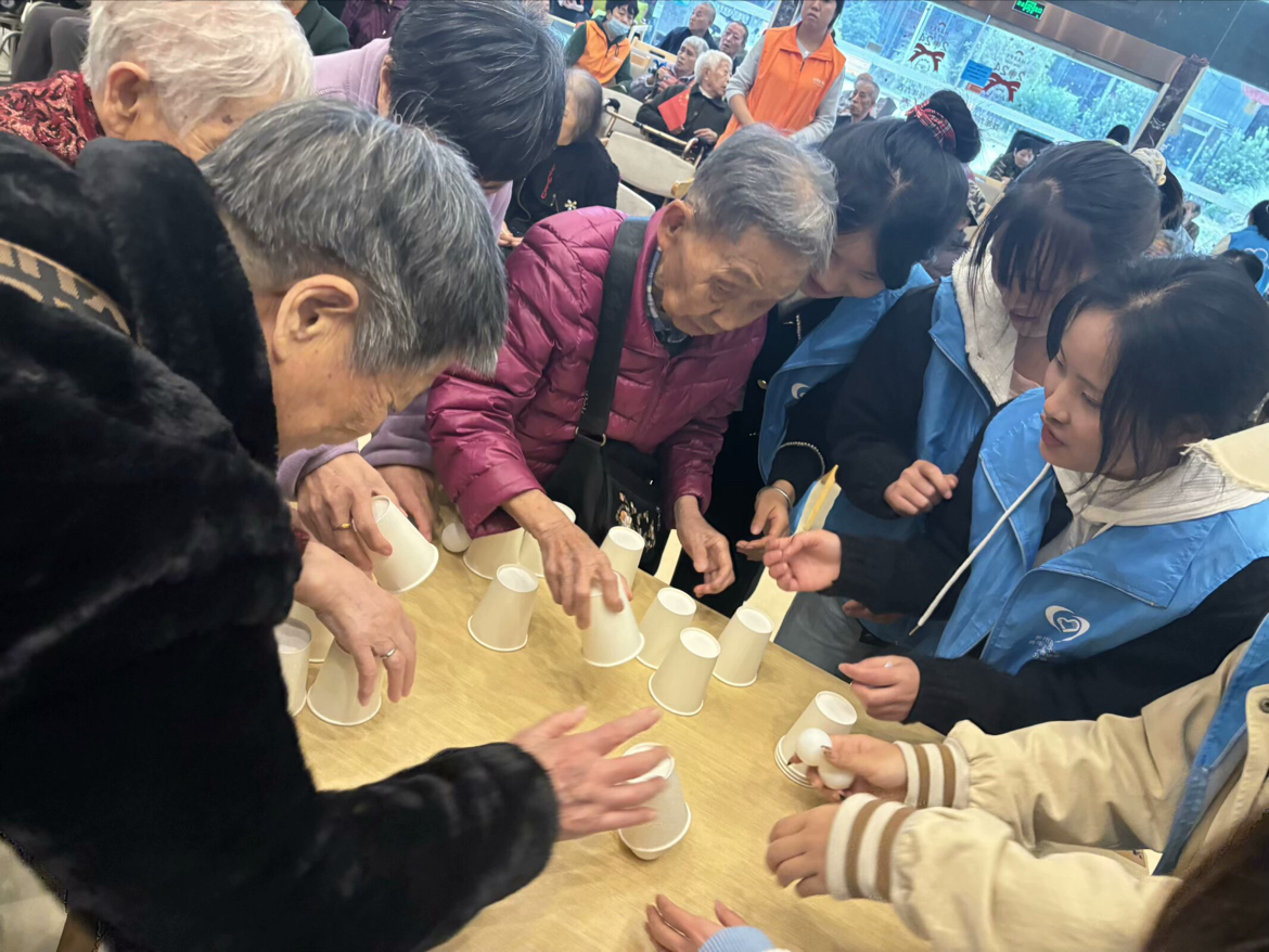 节目展示之后,志愿者们准备了纸杯扣球与抽纸片的小游戏,并热情地邀请各位老人们参与,老人们积极响应,纷纷投身于这场欢乐的互动之中,现场洋溢着一片温馨和谐的氛围。与此同时,志愿者们主动与老人们交谈,倾听他们叙述往昔岁月,那一个个故事如同悠扬的岁月之歌,让人仿佛踏入了他们生命的篇章,一同感受时光的流转与生命的厚重。活动渐入尾声,志愿者们协助院内工作人员归置活动场所,同时与老人们告别并留下合影,活动圆满落幕。与老人们共度的美好时光,将如珍贵的宝石镶嵌于志愿者的心底。这份温暖的记忆,也将伴随着志愿者们一路成长,成为他们难忘的回忆。