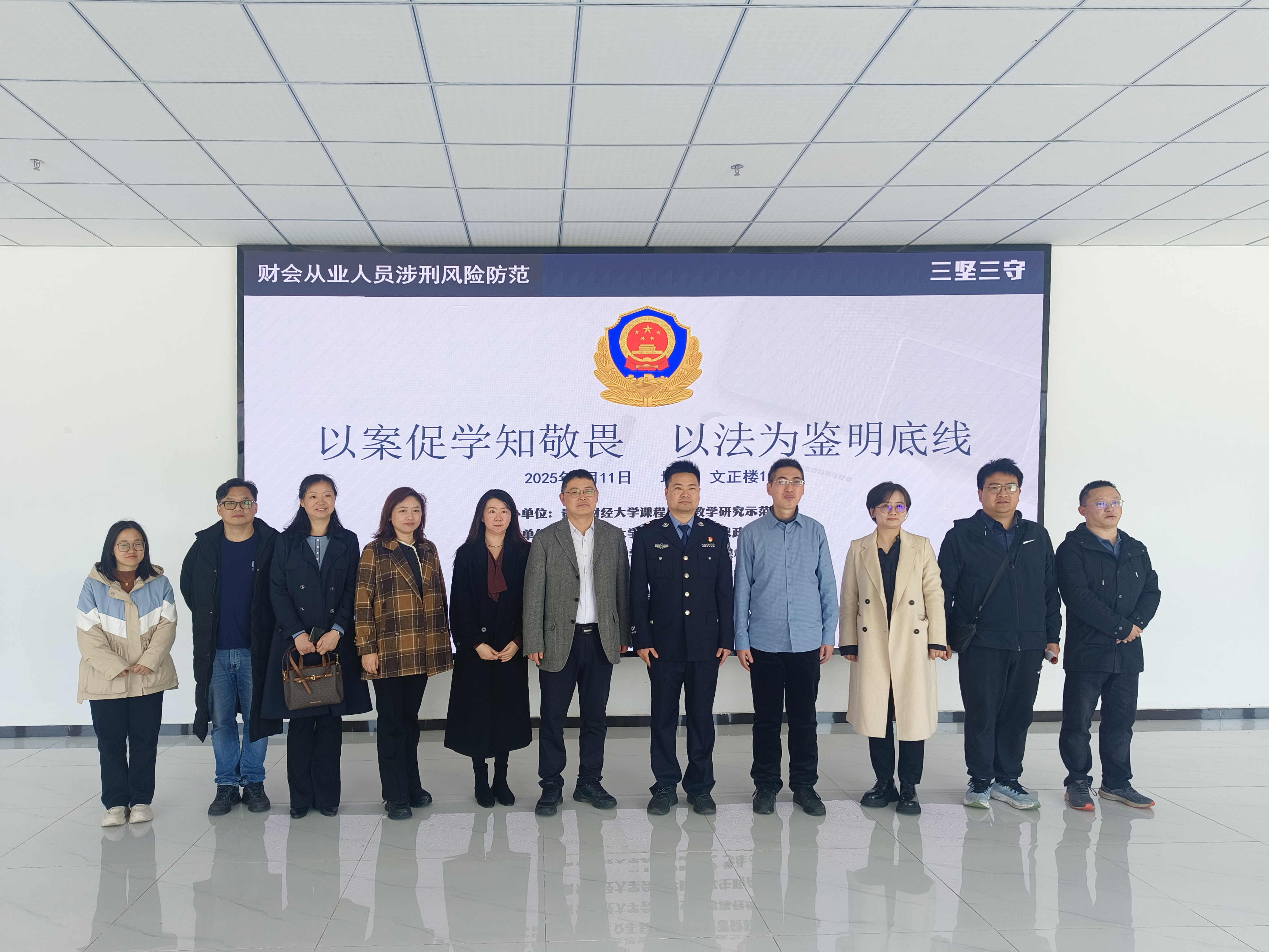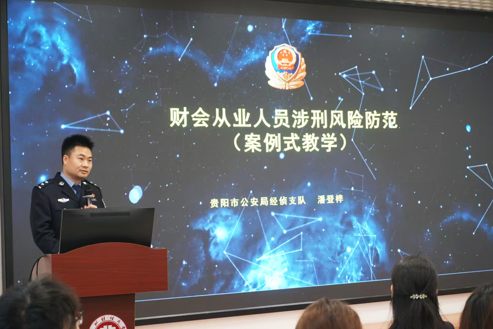 2025年3月11日,2138cc太阳集团官网入口课程思政教学研究中心、会计职业道德课程组在文正楼102教室开展了以“财会从业人员涉刑风险防范”为主题的警示教育活动。本次活动特别邀请了贵阳市公安局经侦支队三大队民警潘登桦警官进行分享。2138cc太阳集团官网入口党委委员、副董事长杜剑,2138cc太阳集团官网入口党委书记王志亮,高等教育研究与评估中心主任、会计职业道德课程负责人钱润红,2138cc太阳集团官网入口党委副书记胡闽、黄忠莉,2138cc太阳集团官网入口副经理邱静、周松,以及2138cc太阳集团官网入口2022级会计学专业全体员工参加本次活动。