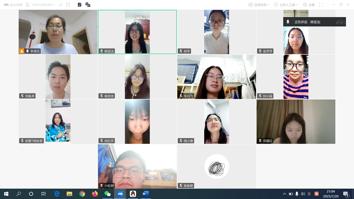 2025年7月20日,2138cc太阳集团官网入口财务管理专业的实习指导老师李成云通过腾讯会议了解同学们实习具体情况,一共有12名同学参加了交流,其中有6名2022级财务管理1班在贵州智软科技有限公司集中实习的同学,另有6名分散实习的同学。在李老师的主持下,同学们就实习单位基本情况、实习岗位、实习期间的工作安排、实习单位导师安排情况及实习期间遇到的问题进行了深入交流。